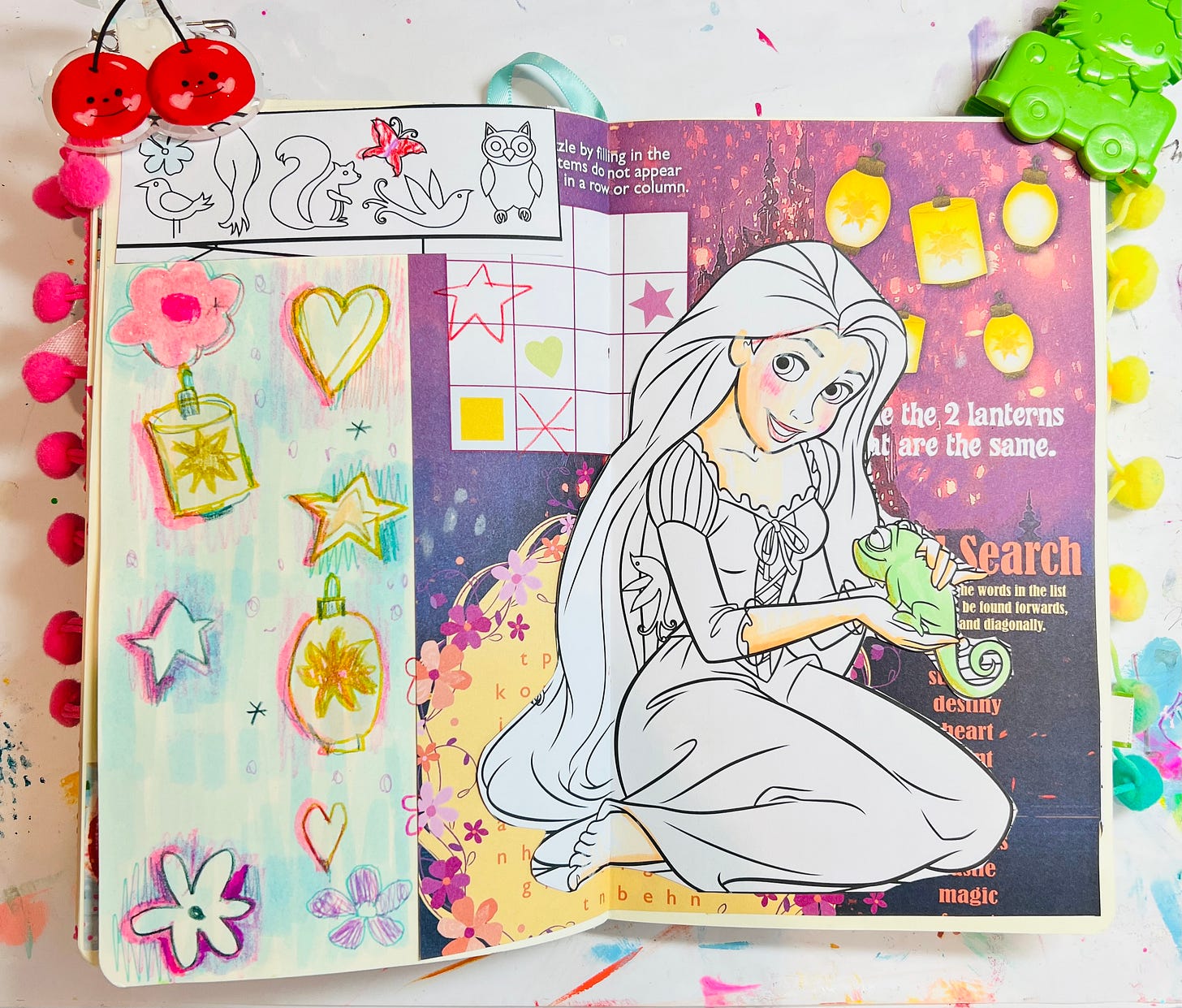 one of my favorite pages from my junk journal. I glued down the Tangled game background and cutout Rapunzel. And then drew my own lanterns inspired by the game page. so fun!